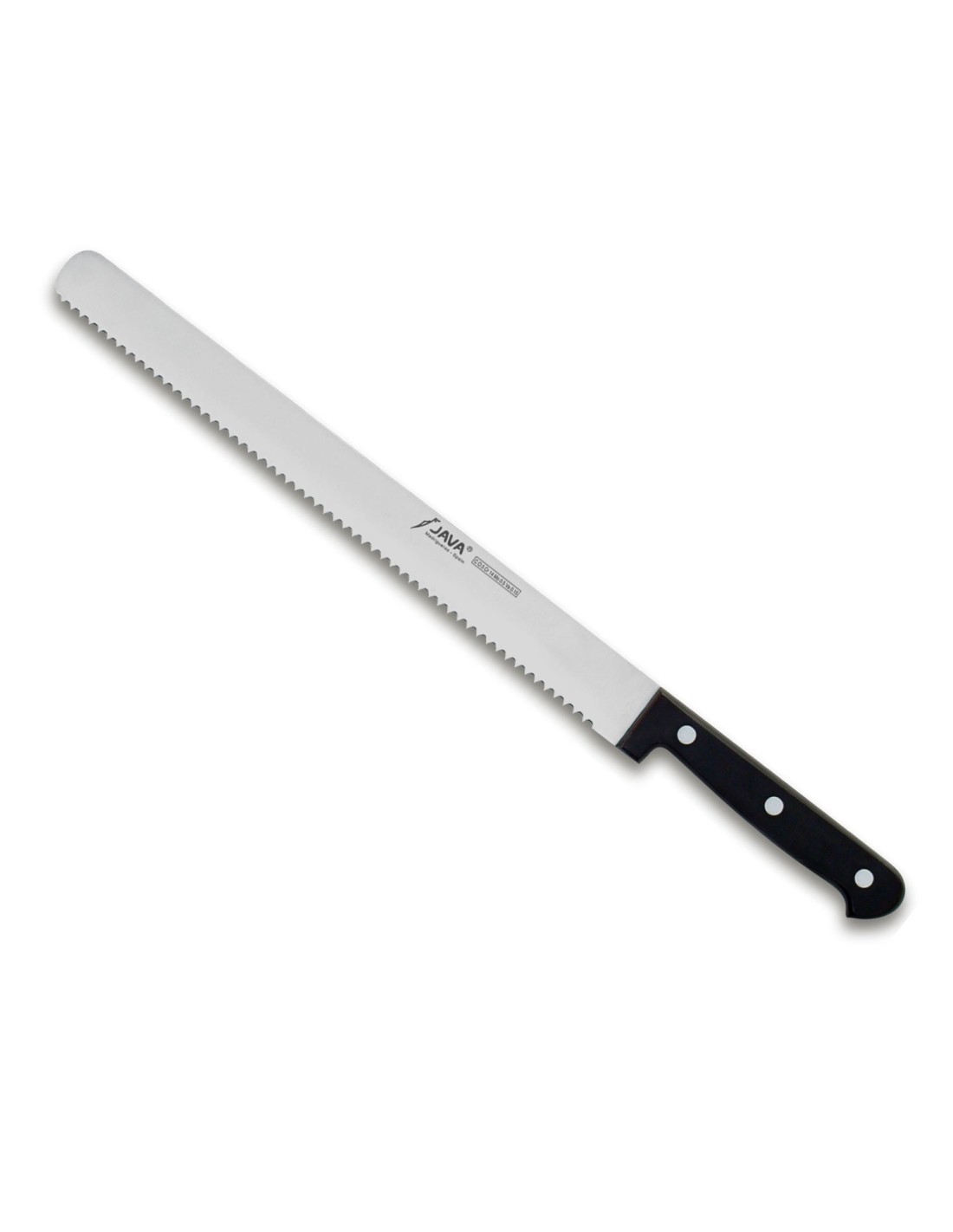 REF 677-12 CUCHILLO DE PAN PROFESIONAL . Por su longitud y su construcción este cuchillo esta pensado en pasteleros y cocineros profesionales que necesitan cortar pan .Indispensable en todo buen restaurante. Hoja de 35 cm de longitud lo que le permite cortar sin dificultad hogazas redondas de pan. Por sus dientes no es necesario ser afilado ni mantenido el filo con ningún medio.